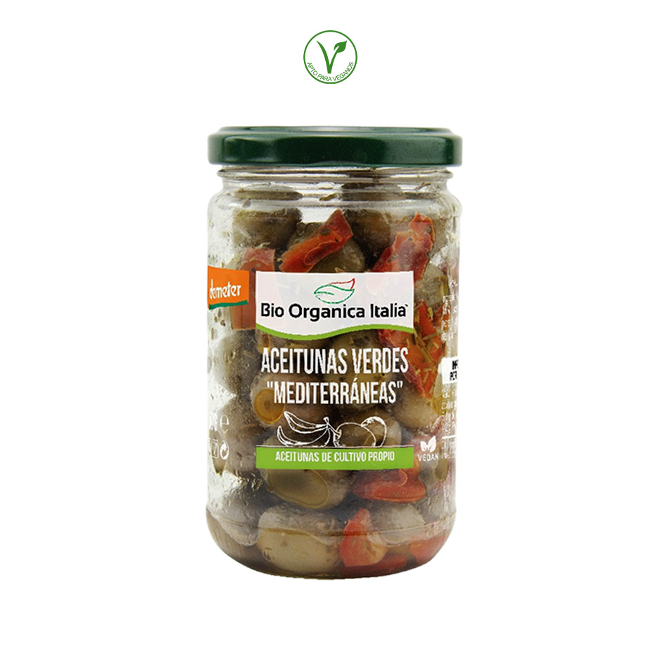 Aceitunas verdes** (78%), pimientos** (15%), aceite de oliva virgen extra** (4%), sal, ajo**, perejil**, albahaca**, orégano**, tomillo**, romero**, jugo de limón**. *= Prodecente de agricultura ecológica. **= Prodecente de agricultura biodinámica.