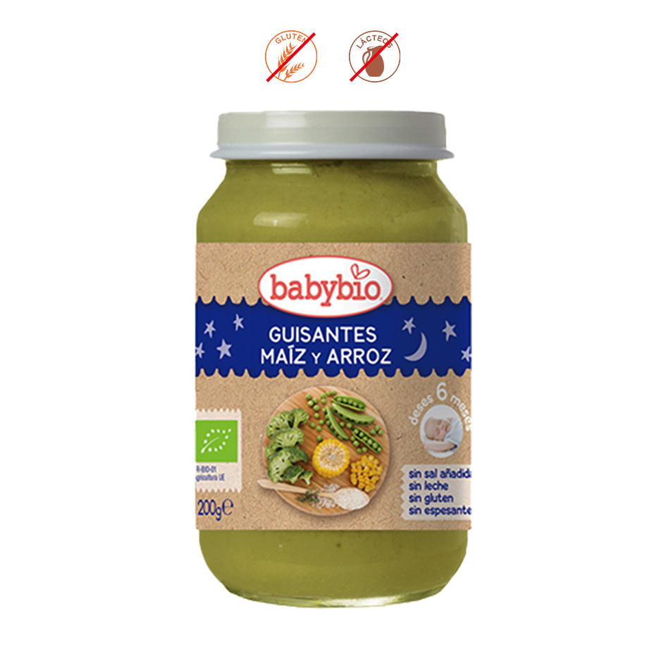 Guisantes* (25%), maíz* (15%), cebolla*, brécol*), agua de cocción, arroz* (7%), aceites vegetales*(colza*, girasol*), tomillo*. *= procedentes de agricultura ecológica.