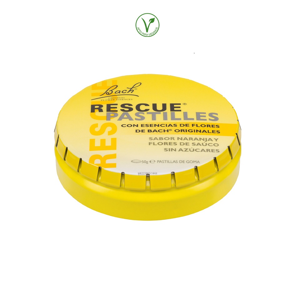 INCI: Edulcorantes (sorbitol, maltitol, isomaltosa, xilitol), espesante (goma arábiga), aromas naturales (flores de saúco, naranja), agente de recubrimiento (aceite vegetal de girasol, cera blanca de abejas), mezcla de las 5 Flores originales de Rescue® Remedy (0.008%).