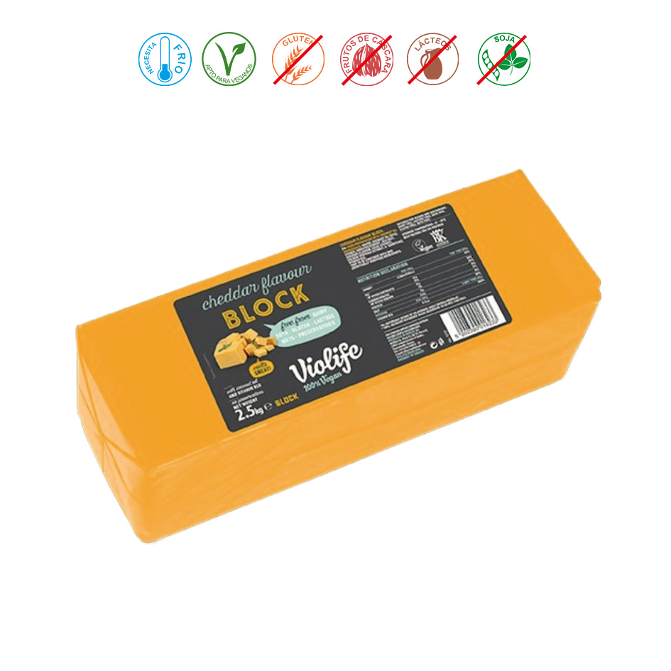 Agua, aceite de coco(24%), almidón modificado*, almidón, sal marina, aroma cheddar, extracto de aceituna, colorante: (extracto de pimentón, betacaroteno), vitamina B12.