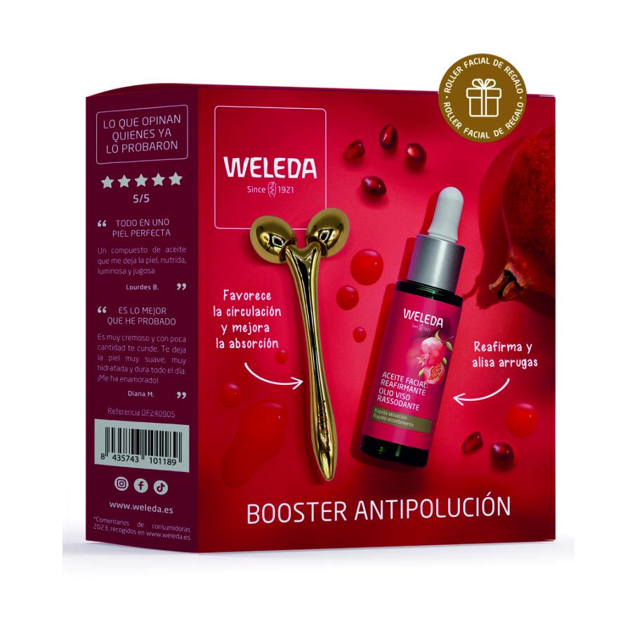 Contiene: 1xWE02368 Aceite Reafirmante Antipolucion Granada – 30ml. • Masajedor Facial