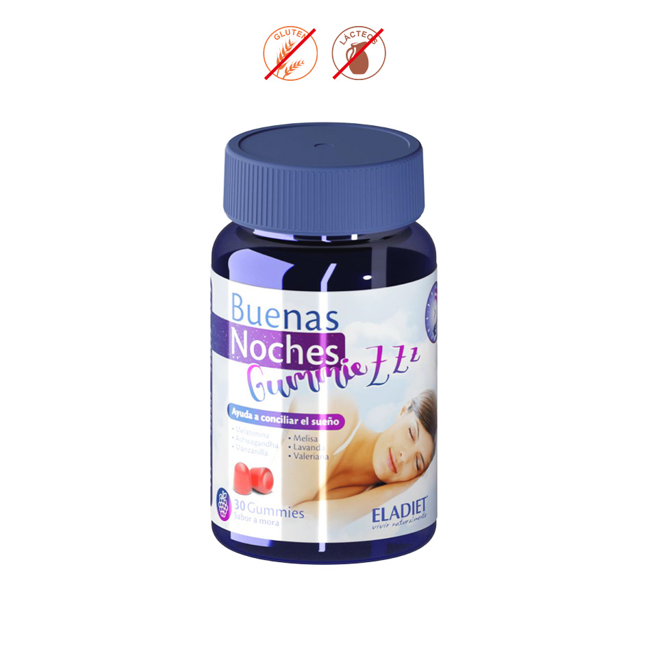 Edulcorantes: Maltitol y Sorbitol; Agua, Gelificante: pectin; Acidulante: Ácido cítrico; Extracto seco de raíz y hoja de ashwagandha (Withania somnifera (L.) Dunal); Extracto seco de flor de manzanilla (Matricaria recutita L.); Extracto seco de hoja de melisa (Melissa officinalis L.); Extracto seco de flor de lavanda (Lavandula angustifolia Miller); Colorante: Antocianinas; Regulador acidez: citratos de sodio; Extracto seco raíz de valeriana (Valeriana officinalis L.); Aceite de coco; Aroma; Melatonina; Agente antiaglomerante: Cera carnauba (coco). º Contenido medio por 1 gominola: • Melatonina · 1mg. • Ashwagandha · 27mg. • Melisa · 27mg. • Lavanda · 27mg. • Manzanilla · 27mg. • Valeriana · 7mg.