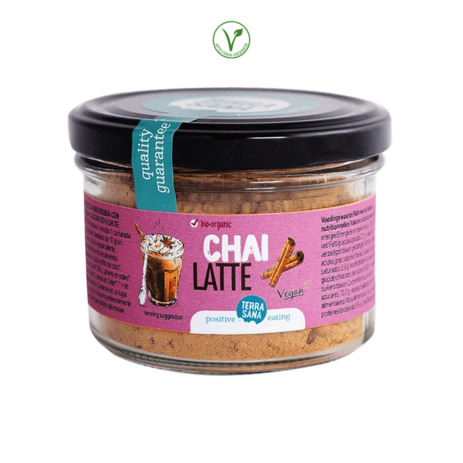 azúcar de la flor de coco*, bebida de arroz en polvo* (arroz*, fibra de avena sin gluten*, aceite de girasol*, sal), té negro en polvo*, polvo de canela cassia* 5,6%, cardamomo en polvo*, clavo de olor en polvo*, pectina. *= Procedente de agricultura ecológica.