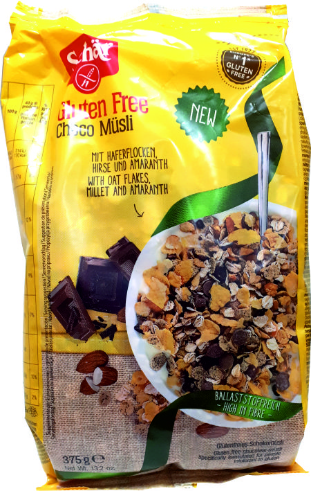 Copos de AVENA sin gluten(25%), harina de maíz, copos de SOJA, chocolate con LECHE(10%) (azúcar, manteca de cacao, LECHE entera en polvo, pasta de cacao, emulgente: lecitina de SOJA, aroma natural de vainilla), chocolate negro(10%) (azúcar, pasta de cacao,manteca de cacao, emulgente: lecitina de SOJA, aroma natural de vainilla), harina de arroz integral, azúcar, harina de alforfón, harina de mijo integral(1,5%), cacao desnatado en polvo, copos de amaranto(0,5%), ALMENDRAS(0,5%), sal, jarabe de glucosa, emulgente: lecitina de girasol.