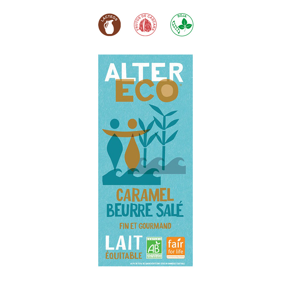 Azúcar de caña^*, manteca de cacao^*, LECHE entera en polvo*, chips de caramelo con MANTEQUILLA salada* (10%) (azúcar^*, jarabe de glucosa*, MANTEQUILLA*, CREMA*, agua, sal de guerande), pasta de cacao^* (Ecuador y Perú), crema de LECHE en polvo^, sal de Guerande, vaina de vainilla^*. *= Procedente de agricultura ecológica. ^= Procedente de comercio justo