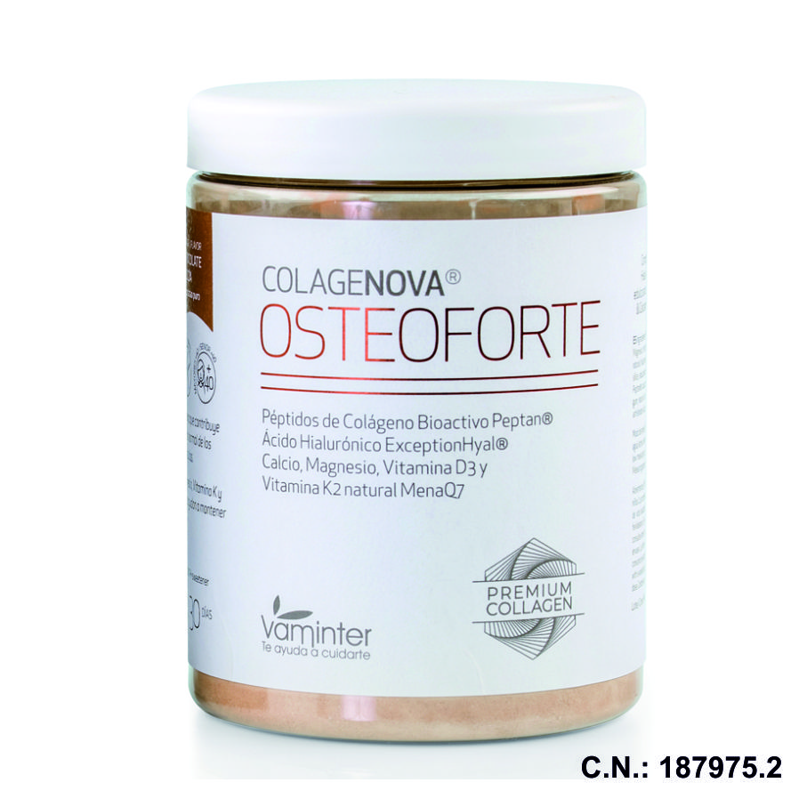 Colágeno hidrolizado Peptan, cacao en polvo, citrato de magnesio, tricitrato de calcio, espesante:(goma de acacia, goma xantana), extracto de cacao, hialuronato sódico, vitamina K2, emulsionante:(lecitina de girasol), antiaglomerante:(silice), edulcorante:(sucralosa), vitamina D3. º Contenido medio por dosis (14gr.): • Péptidos colágeno Peptan® · 10gr. • Calcio (citrato) · 200mg. · 25%VRN • Magnesio (citrato) · 150mg. · 40%VRN • Vitamina K2 natural MenaQ7 · 180µg. · 240%VRN • Vitamina D3 · 5µg. · 100%VRN