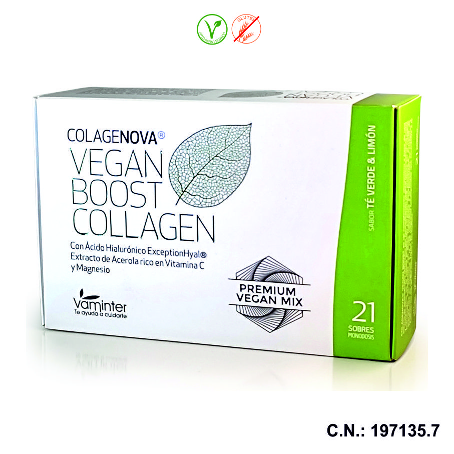 Mezcla de aminoácidos: (L-Glicina, L-Prolina, L-Hidroxiprolina, ácido L-Glutámico, L-Alanina, L-Arginina), extracto de acelora frutos(Malpighia graba) estandarizado en vitamina C, maltrodextrina, polvo deshidratado de jugo de limón, magnesio gluconato, aroma natural té verde, aroma natural de limón, corrector de acidez:(ácido cítrico), hialuronico de sodio, antiaglomerante:(sílice), edulcorante:(glucósidos de esteviol, sucralosa. º Contenido medio por 1 sobre: • Mix Vegan Bosst Collagen · 5gr. • con: L glicina · 1250gr. • L-Prolina · 812mg. • L-Hidroxiprolina · 750mg. • L-Ácido glutamico · 675mg. • L-Alanina · 500mg. • L-Arginina · 4100mg. • Ext. de Acerola · 500mg. • con Vitamina C · 100mg. · 125%VRN • Gluconato de magnesio · 500mg. • Con mangnesio · 25mg. · 6,6%VRN • Ácido Hialurónico · 100mg.