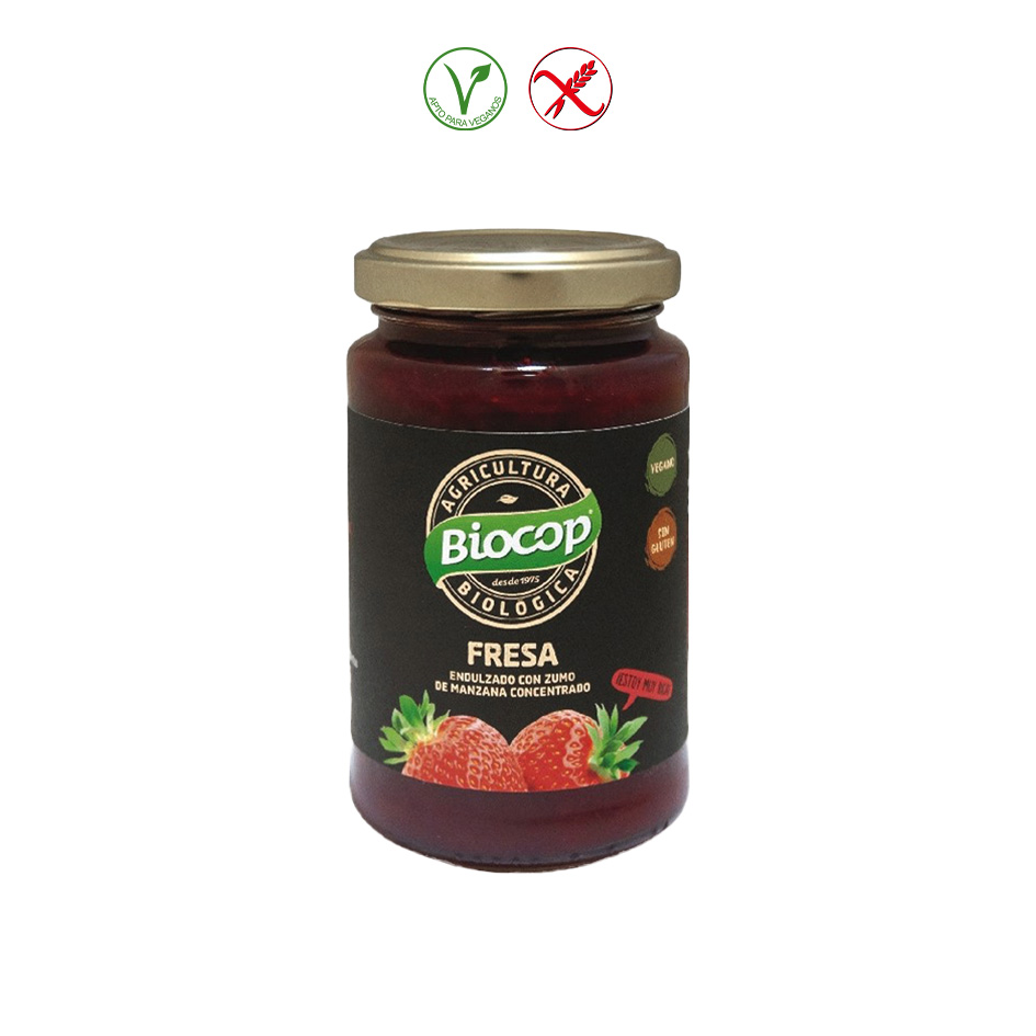 Fresas*(65%), zumo de manzana concentrado*(33%), gelificante: pectina, corrector de acidez: ácido cítrico. *= Procedente de agricultura ecológica.