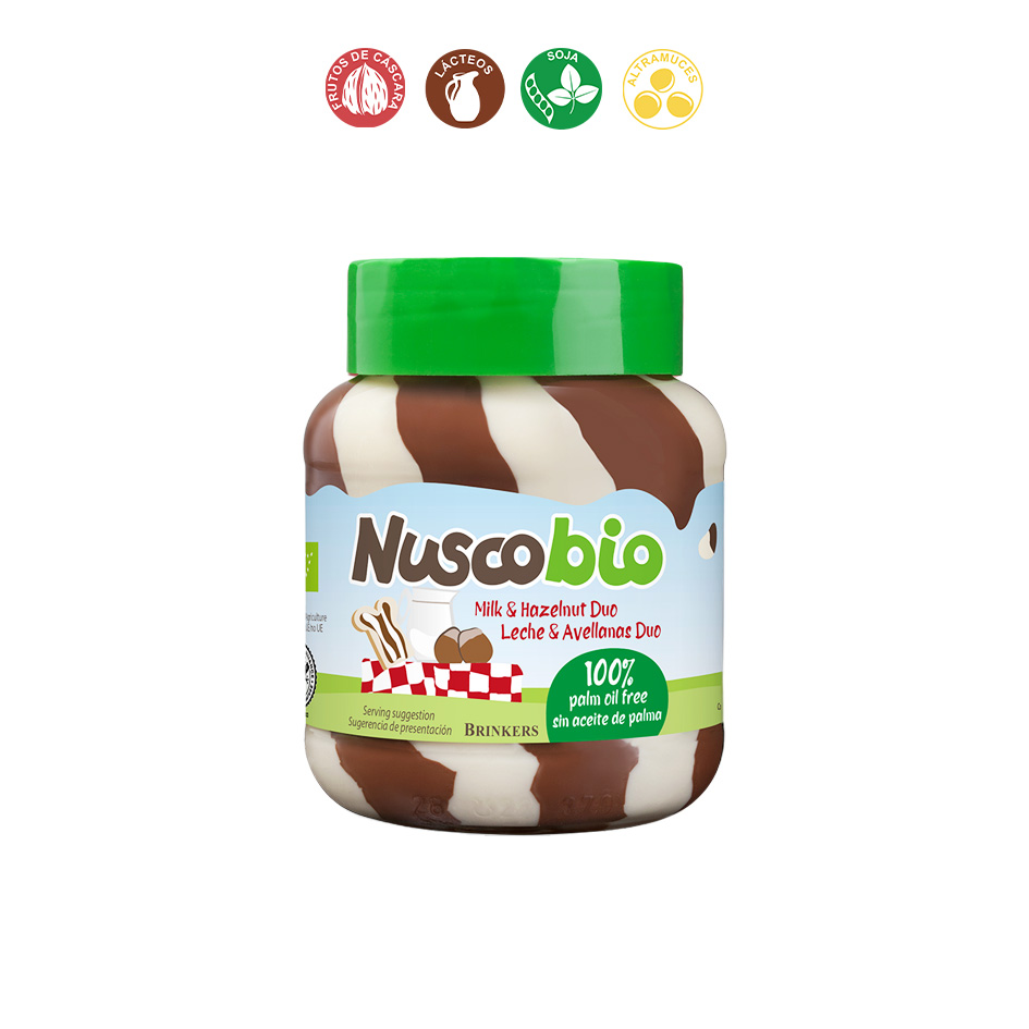 Azúcar de caña*, aceites vegetales* (girasol), AVELLANAS*(6,5%), LECHE desnatada en polvo*(5%), manteca de cacao*, cacao magro en polvo*(2,5%), LECHE entera en polvo*(2,5%), emulgente: lecitina de SOJA*, extracto de vainilla Bourbon*. *= Procedente de agricultura ecológica.