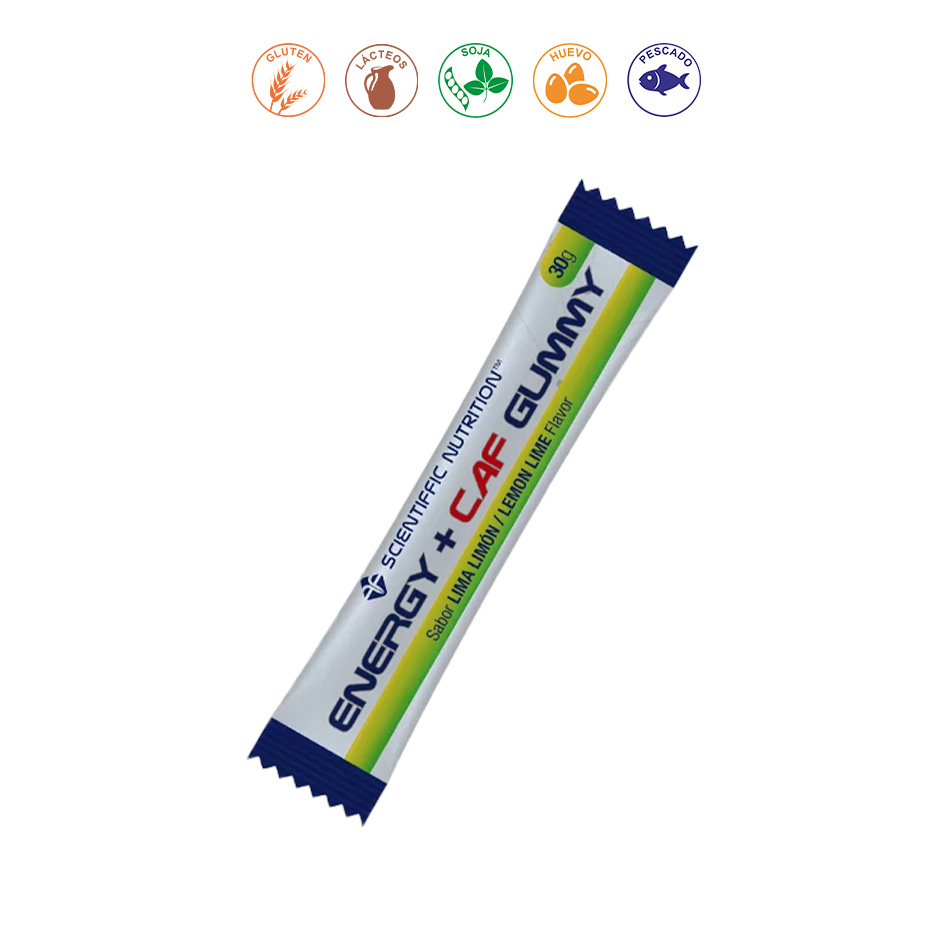 INCI: Jarabe de Glucosa, Azúcar, Agua, Pectina [Pectina, Correctores de Acidez: Tartrato de Sodio-Potasio y Polifosfato, Maltodextrina], Corrector de Acidez: Ácido Cítrico, Citrato de Magnesio, Aroma, Citrato de Potasio, Sal Marina, L-Tirosina, Cafeína (0,3%), Aceite de Recubrimiento [Aceite de Coco, Agente de Recubrimiento: Cera de Carnauba] y Colorante: Clorofilina. º Contenido medio por 100 gr • Valor Energético · 1358kJ=320Kcal • Grasas · 0,3 g • de las cuales saturadas · 0,2 g • Hidratos de Carbono · 77,6 g • de los cuales azúcares · 67 g • Proteínas · 0,4 g • Sal · 0,83 g • L-Tirosina · 333,4 mg • Cafeína · 266,7 mg • Por 30 gr • Valor Energético · 407kJ=96Kcal • Grasas · 0,1 g • de las cuales saturadas · 0,1 g • Hidratos de Carbono · 23,3 g • de los cuales azúcares · 20,1 g • Proteínas · 0,1 g • Sal · 0,25 g · L-Tirosina · 100 mg • Cafeína · 80 mg
