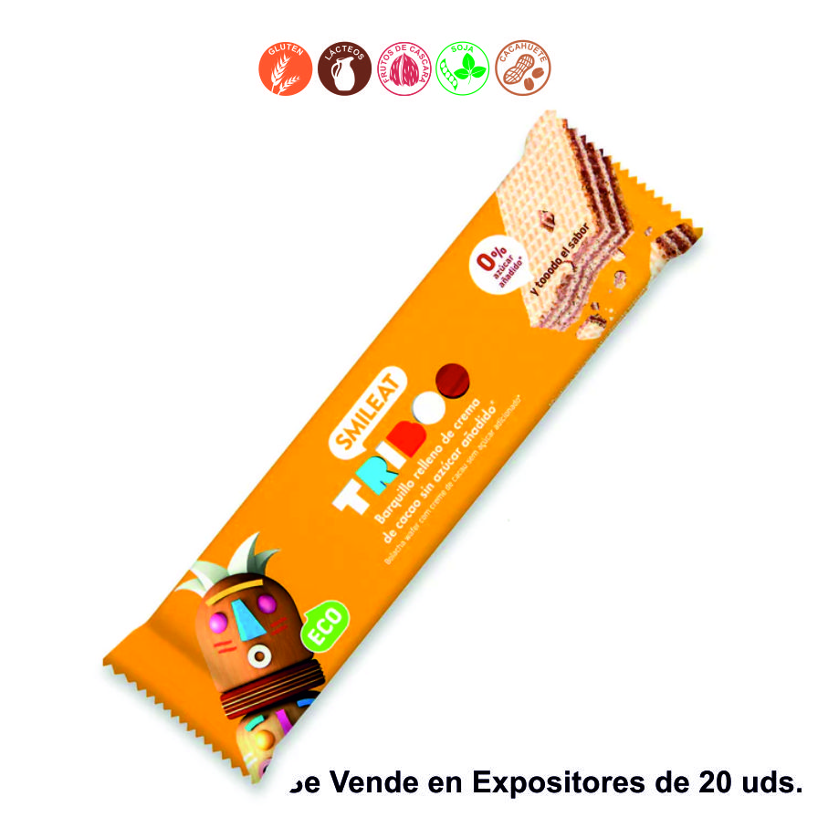 Barquillo (34%) (harina integral de TRIGO escanda*, aceite de girasol*, gasificante: bicarbonato sódico, sal), relleno (66%) (inulina de agave*, aceite de coco*, tahini de girasol*, LECHE desnatada en polvo*, cacao en polvo* 4.2%, antioxidante: extracto de romero*). *= Procedente de agricultura ecológica.