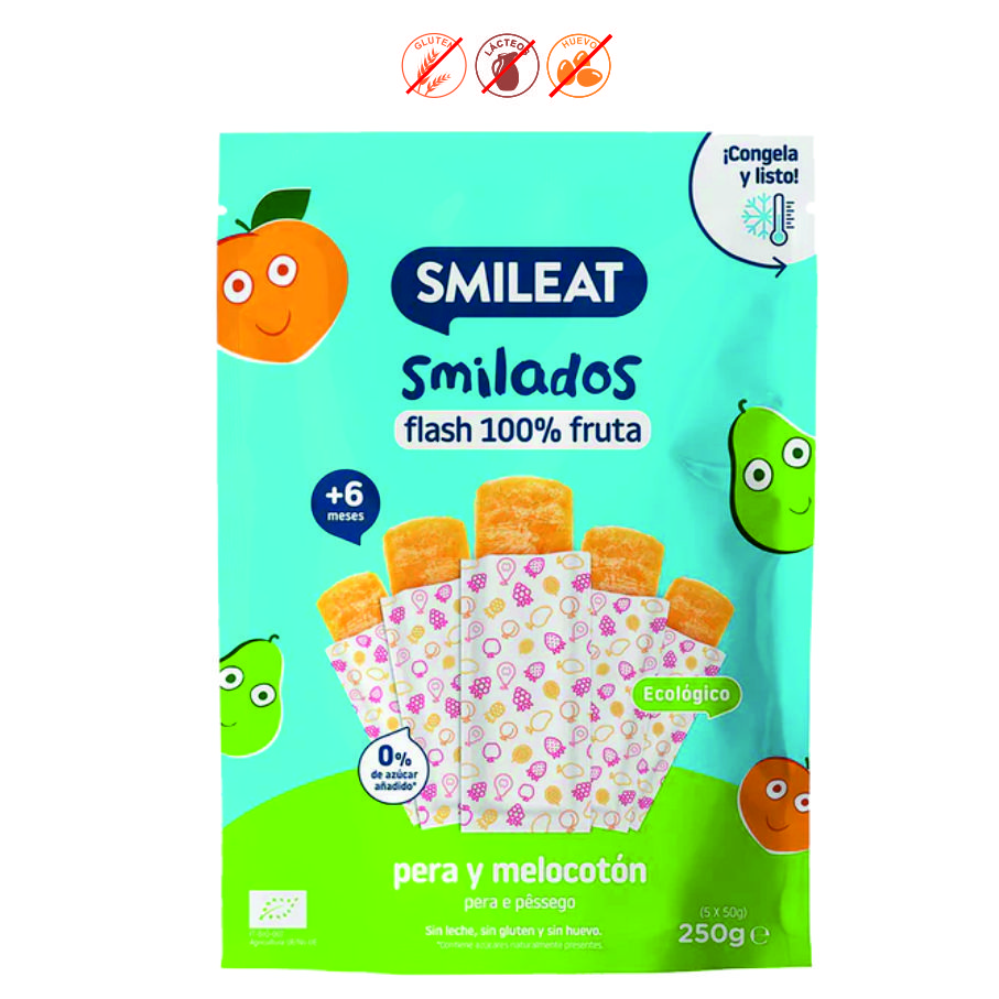 Snack de fruta ecológica para congelar en casa, elaborado a base de puré de melocotón, pera y zumo de uva