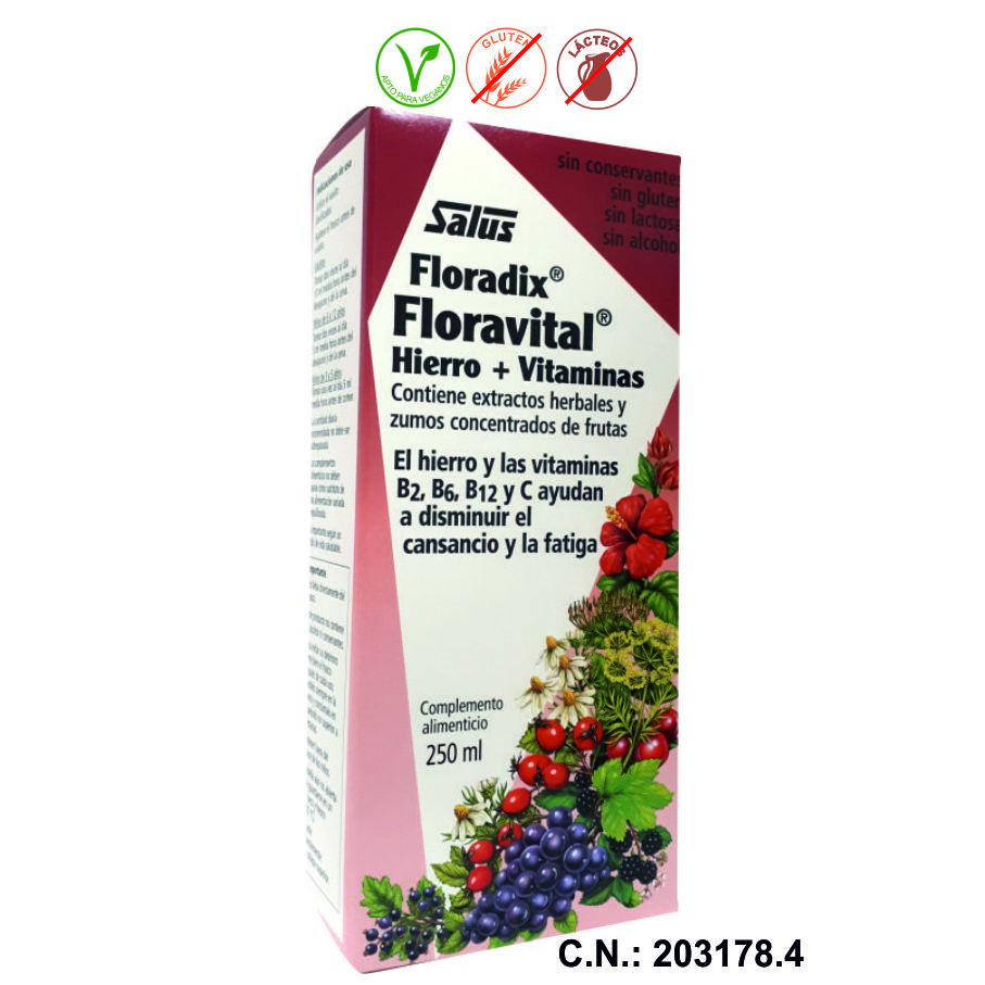 Extracto acuoso (70%) de: (flores de hibisco, flores de manzanilla, frutos de hinojo y hojas de espinaca.), mezcla de concentrados de jugos de fruta (27%): (concentrado de jugo de uva y pera, jugo de grosella negra, concentrado de jugo de cereza, zarzamora y zanahoria), gluconato ferroso, extracto blando acuoso de escaramujo con un 4% de vitamina C, vitamina C, vitamina B1, vitamina B2, vitamina B6 y vitamina B12. º Contenido medio por 10ml:• Hierro · 7,5mg. · 69%VRN • Vitamina C · 8mg. · 10%VRN • Vitamina B1 · 0,86mg. · 78%VRN • Vitamina B2 · 0,86mg. · 61%VRN • Vitamina B6 · 0,86mg. · 61%VRN • Vitamina B12 · 0,86µg. · 34%VRN