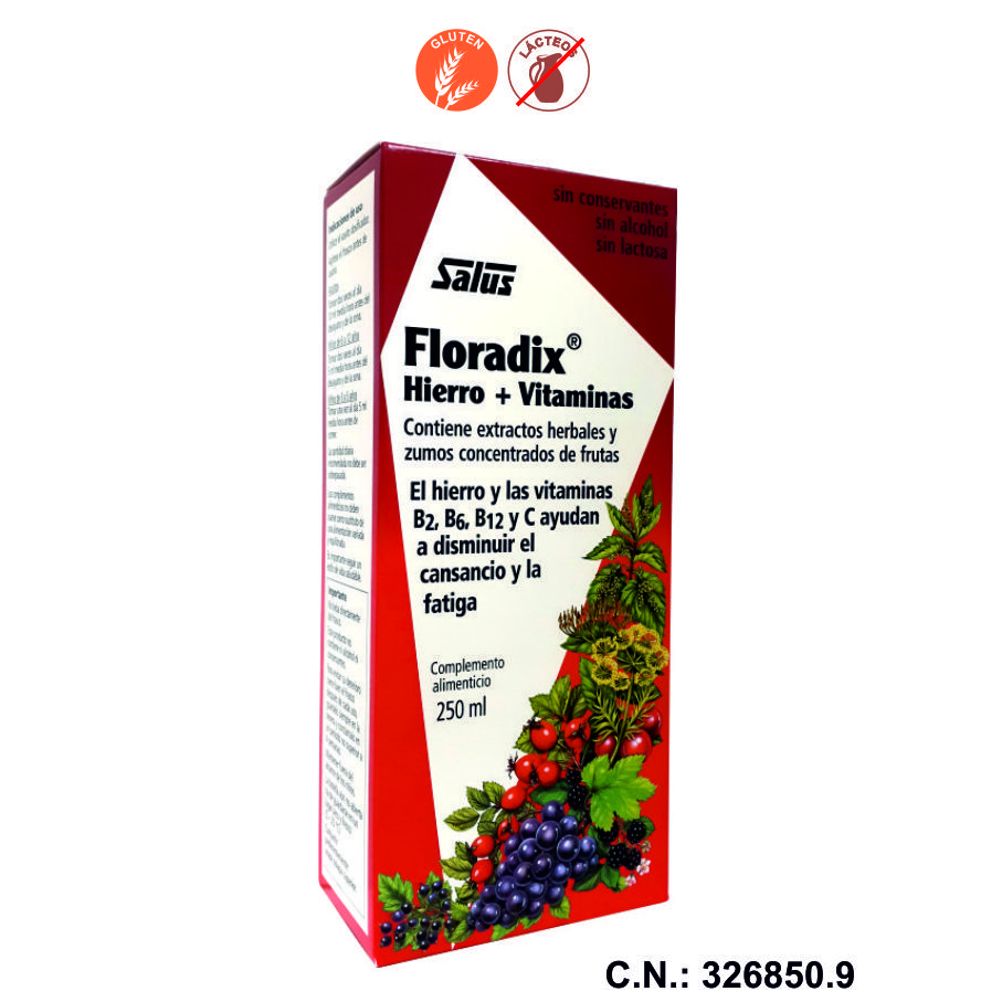 Extracto acuoso (54%) de: (zanahoria, hojas de ortiga, hojas de espinaca, raíz de grama, frutos de hinojo, alga marina, flores de hibisco.), mezcla de concentrados de jugos de fruta (29,4%): concentrado de jugo de pera y uva, jugo de grosella negra, concentrado de jugo de zarzamora, cereza, naranja, remolacha, extracto de algarroba, agua, concentrado de jugo de limón y manzana, extracto acuoso de levadura (Saccharomyces cerevisiae), miel, extracto blando acuoso de escaramujo con un 4% de vitamina C, gluconato ferroso, extracto de germen de TRIGO, vitamina C, aromas naturales, vitaminas B1, B2, B6, B12. º Contenido medio por 10ml: • Hierro · 9,6mg. · 54%VRN • Vitamina C · 8mg. · 10%VRN • Vitamina B1 · 0,8mg. · 73%VRN • Vitamina B2 · 0,9mg. · 64%VRN • Vitamina B6 · 0,4mg. · 29%VRN • Vitamina B12 · 0,6µg. · 24%VRN