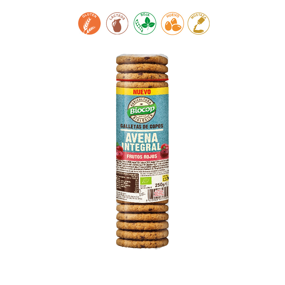 Copos de AVENA integral*(31%), harina de TRIGO integral* (30%), aceite de semillas de girasol*, azúcar de caña*, arándanos rojos* (8%) (Arándanos rojos*, zumo concentrado de manzana*, aceite de semillas de girasol*), malta de CEBADA*, gasificantes ( bicarbonato de amonio, bicarbonato de sodio), aroma natural de frambuesa, sal.