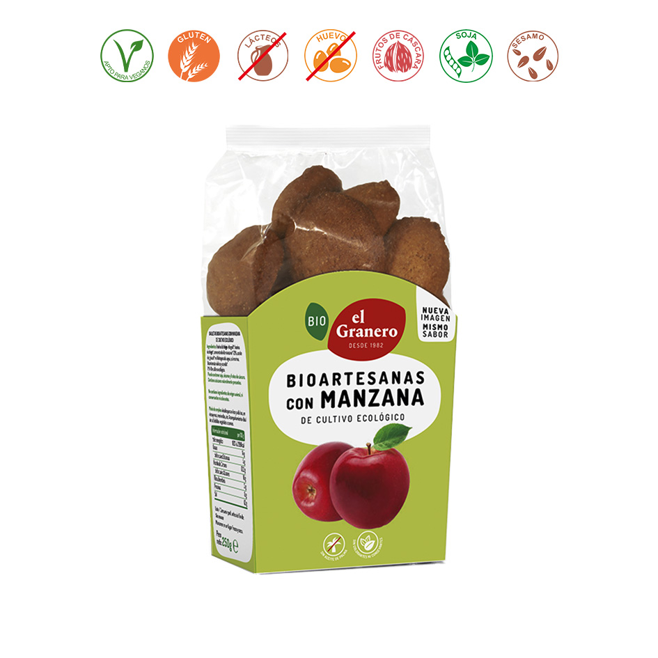 harina de TRIGO integral*, harina de TRIGO*, concentrado de manzana*(22%), aceite de girasol no hidrogenado*, agua, sal marina, bicarbonato sódico y canela*. *= Procedente de agricultura ecológica.
