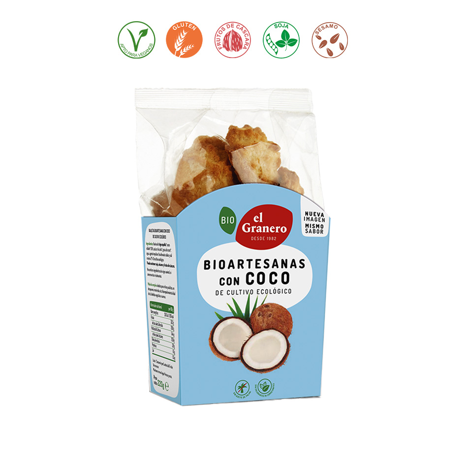 harina de ESPELTA*, coco rallado*(20%), azúcar de caña*, aceite de coco*, agua, agente impulsor: bicarbonato sódico y sal marina. *= Procedente de agricultura ecológica.