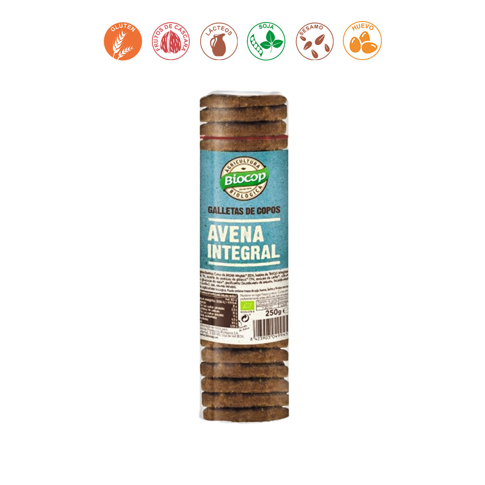 Copos de AVENA*(35%), Harina de TRIGO integral*(34%), aceite de girasol*(17%), azúcar de caña*, jarabe de glucosa de maíz*, gasificante(bicarbonato de amonio y bicarbonato de sodio), sal, aroma natural. *= Procedente de agricultura ecológica.