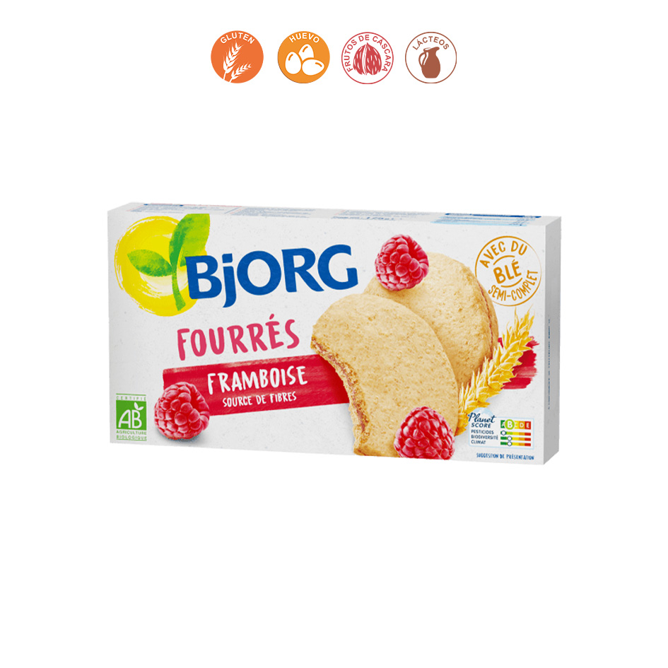Harina de TRIGO semi-integral* 43,5%, azúcar de caña* no refinada 17%, margarina* (aceite de girasol *, manteca de cacao*, agua, emulsionante: lecitina de girasol*, zumo de limón*), jarabe de azúcar*, jarabe de TRIGO*, miel*, HUEVO en polvo*, concentrado de frambuesa* (0,7%) (equivalente a 7% de frambuesa), acidificante: ácido cítrico, sal marina, levadura en polvo, carbonato de Sodio y carbonato de Amonio. *= Procedente de agricultura ecológica.
