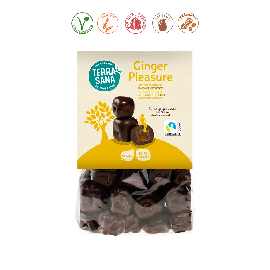 chocolate*(65,9%)(azúcar de caña*, manteca de cacao*, mantequilla de cacao*, extracto de vainilla Bourbon*), jengibre*(34%)(jengibre*, azúcar*), agentes de recubrimiento: goma arábiga*. *= Procedente de agricultura ecológica.