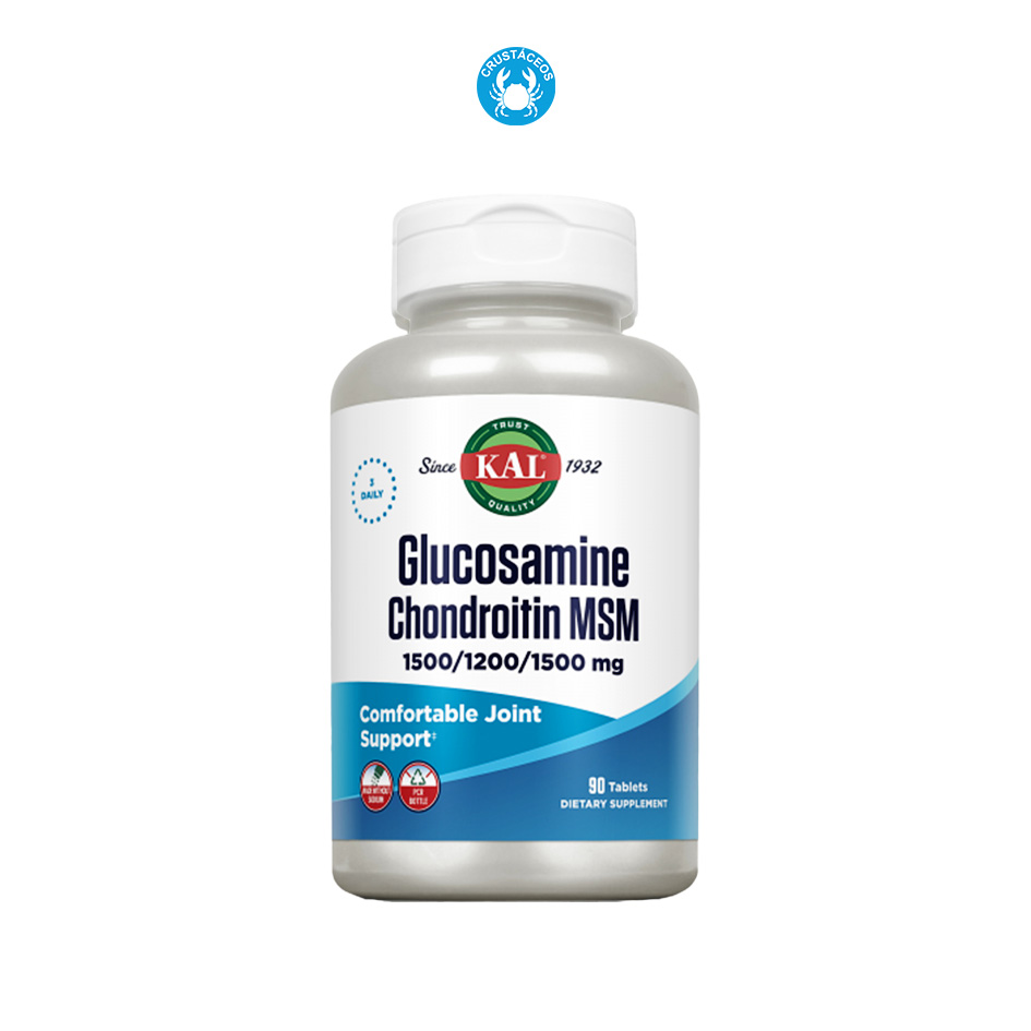 MSM (metilsulfonilmetano), sulfato de glucosamina [MARISCO], sulfato de condroitina, vitamina C (ácido asrcórbico), calcio, recubrimiento: celulosa, antiaglomerante: sílice y ácido esteárico. º Contenido medio por 3 comprimidos: • MSM (metilsufonilmetano) · 1500mg. • Sulfato de glucosamina KCl [MARISCO] · 1500mg. • Sulfato condroitina (bovino) · 1200mg. • Vitamina C (ácido asrcórbico) · 300mg. · 375%VRN • Calcio · 80mg. · 10%VRN