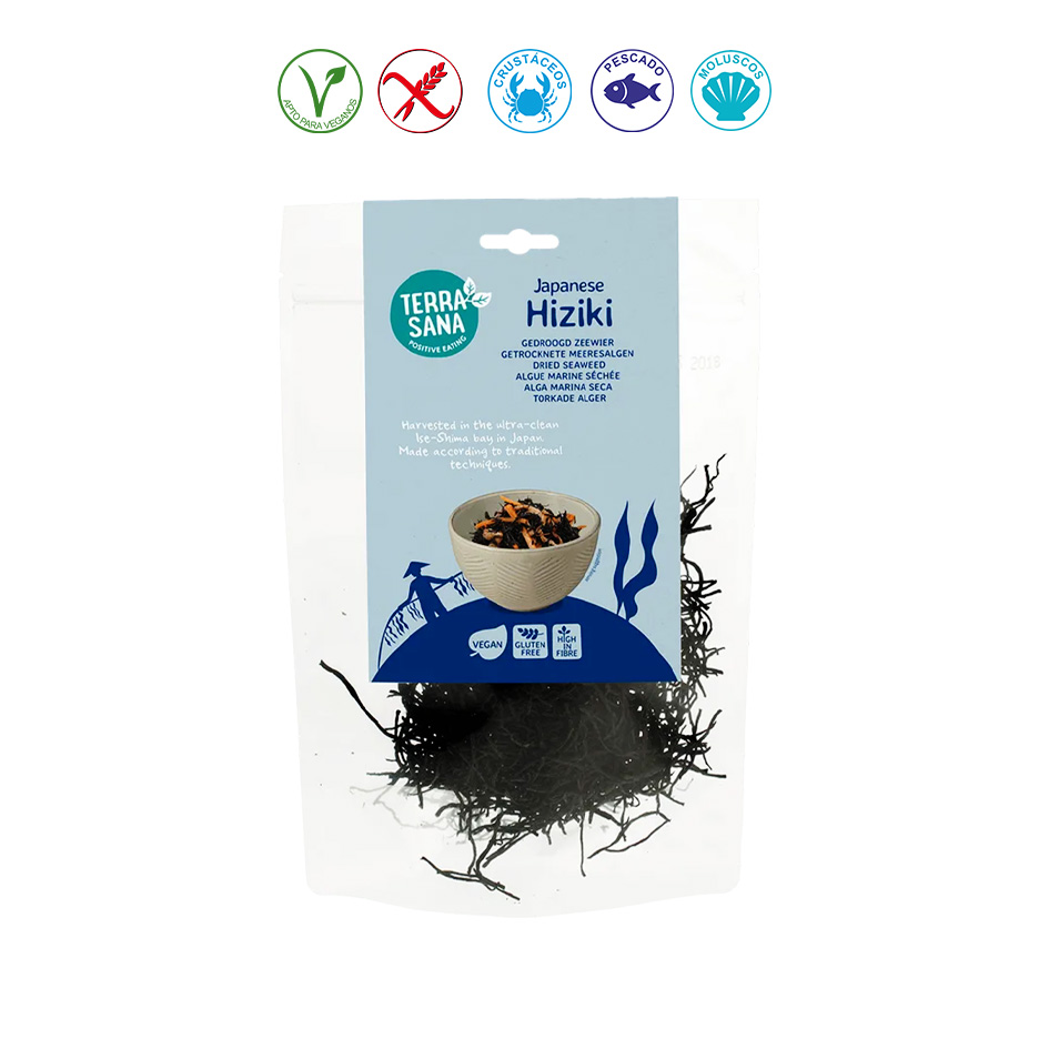 Hiziki se usa como guarnición. Enjuague varias veces, remojar durante 10 minutos y escurrir. Deseche el agua de remojo. Hervir le Hiziki si es necesario. aproximadamente 15 minutos, junto con otras verduras.
