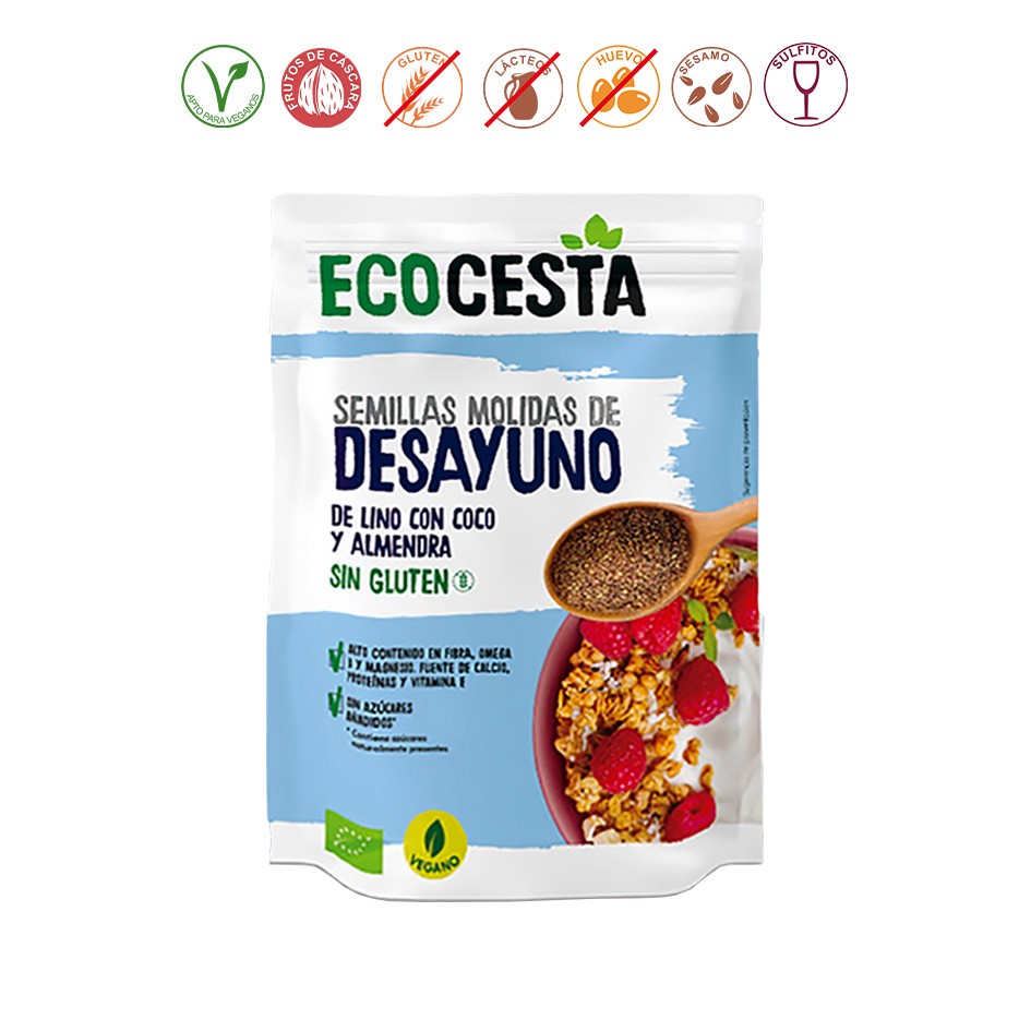 semillas de lino* molidas (65%), coco* rallado (20%) y ALMENDRAS* molidas (15%). *= Procedente de agricultura ecológica.