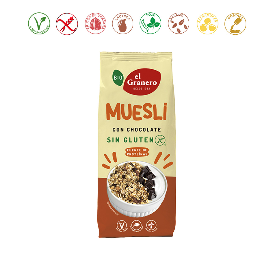 copos de avena* integral sin gluten (81%), copos de maíz tostado con chocolate negro* (6,5%) (maíz*, pasta de cacao*, azúcar de caña* integral, manteca de cacao*, sal marina), láminas de chocolate negro* (6%) (azúcar de caña* integral, pasta de cacao*, manteca de cacao*, emulsionante: lecitina de girasol*), copos de arroz* (4%) (arroz*, azúcar de caña* integral, sirope de arroz*, sal marina), y bolitas de maíz con chocolate negro* (2,5%) (azúcar de caña* integral, semolina de maíz*, pasta de cacao*, manteca de cacao*, cacao en polvo*, sal marina), cacao en polvo* (0,5%) * = Procedente de agricultura ecológica.