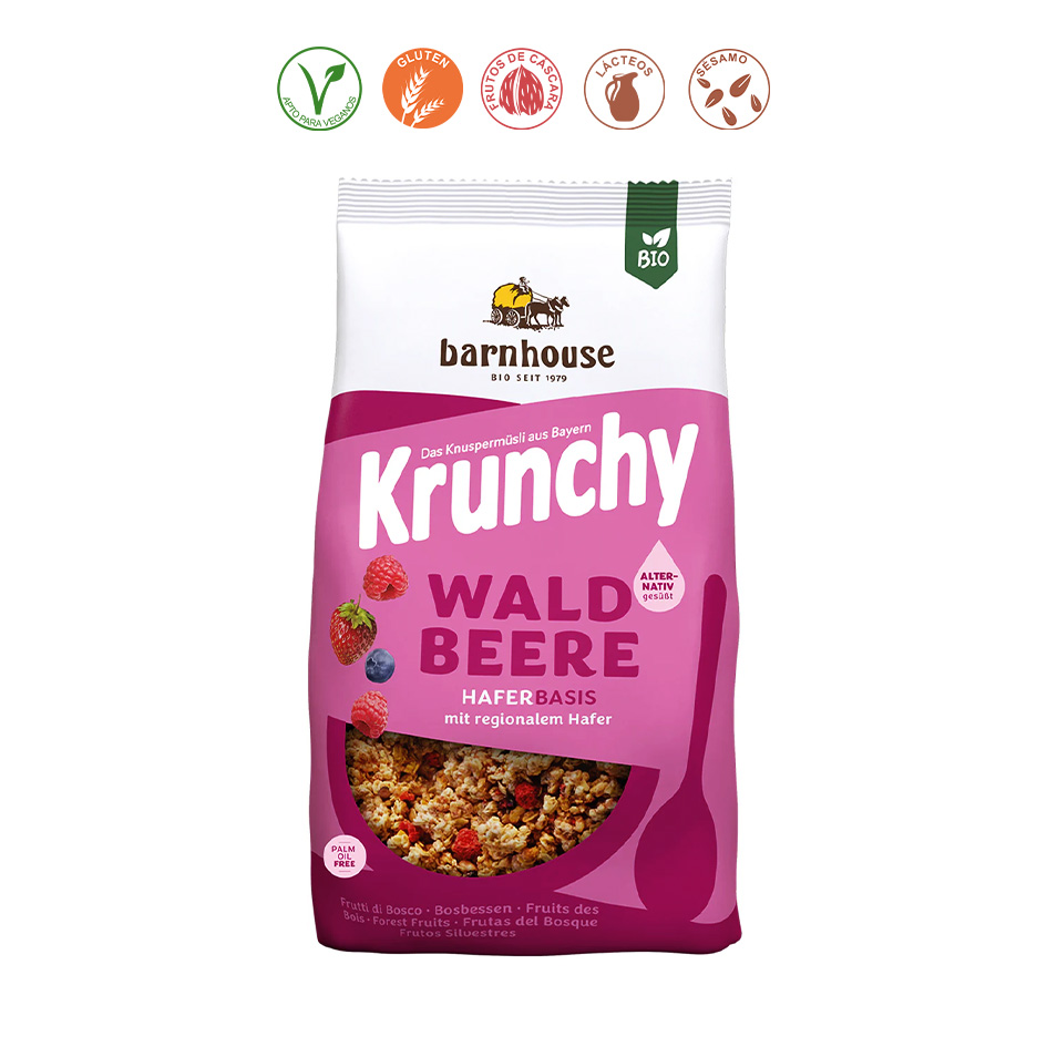 Copos de [AVENA*] integral, sirope de glucosa de arroz*, aceite de girasol*(9%), arroz extruido*(arroz*, [CEBADA*] malteada, sal marina), mezcla de frutas del bosque liofilizadas*(2,5%)(frambuesas*, arándanos*, fresas*), [ESPELTA*] inflada, coco. *= Procedente de agricultura ecológica.