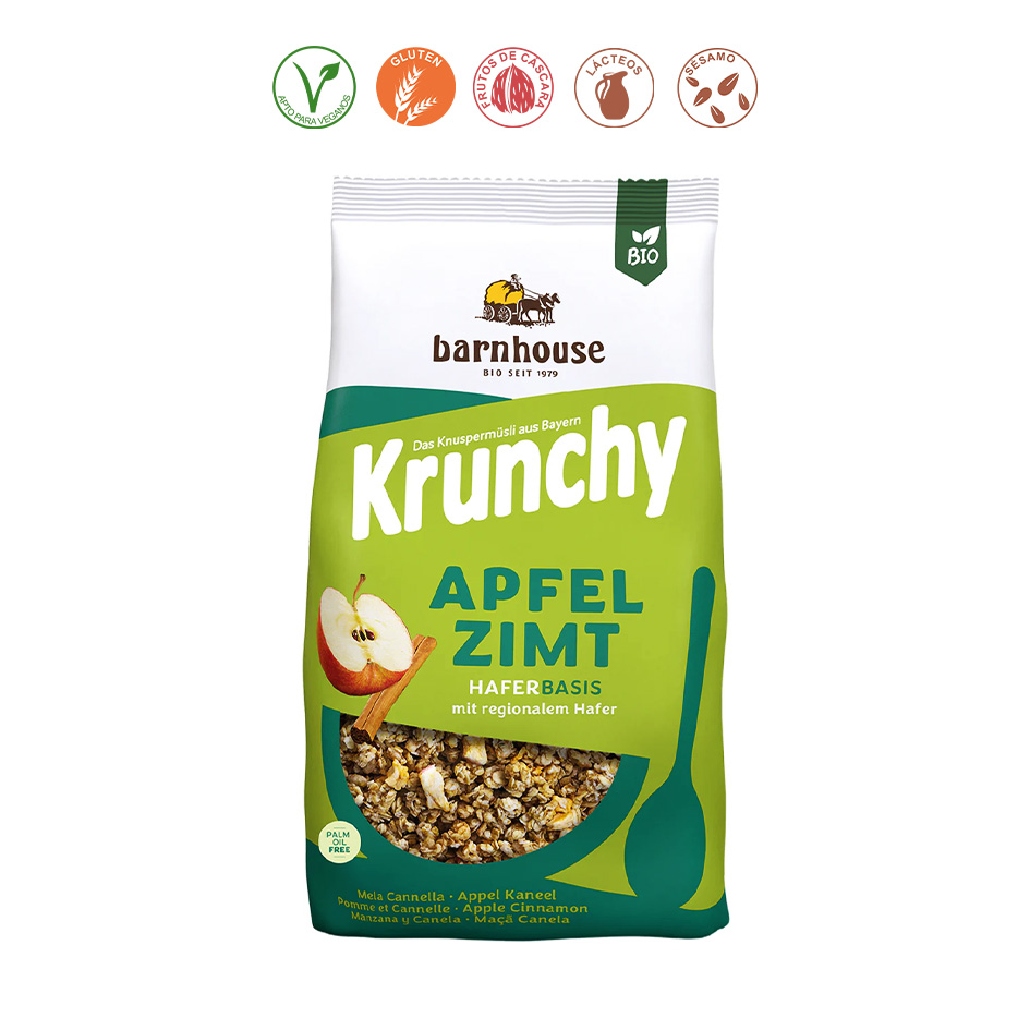 Copos de [AVENA*] integral 61%, azúcar de caña*, aceite de girasol* (11%), copos de [TRIGO*] integral (9%), arroz* extruido (arroz*, [CEBADA*] malteada, sal marina), sirope de glucosa de [TRIGO*], manzana* (3,9%), pasas* (2%), sirope de manzana* (1,1%), canela* (0,5%), sal marina. *= Procedente de agricultura ecológico.