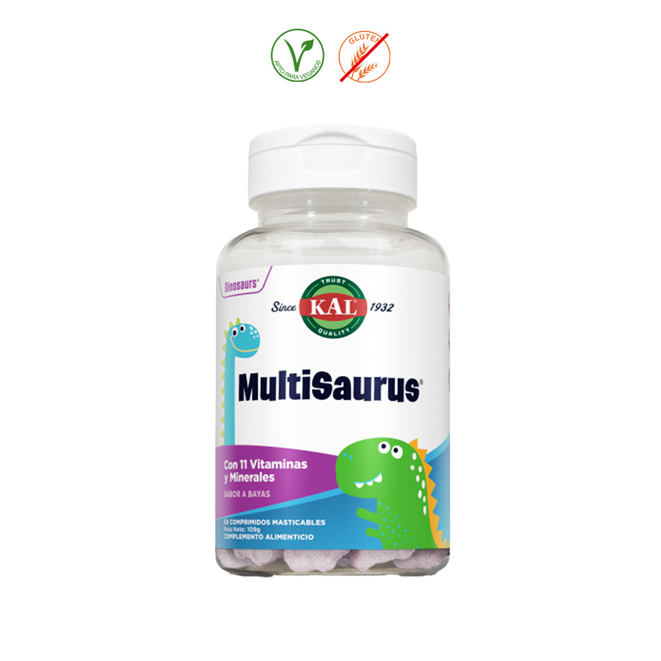 Vitamina C (ácido ascórbico), calcio (carbonato de calcio), magnesio (óxido de magnesio), niacina (niacinamida), ácido pantoténico (pantotenato de calcio), vitamina E (acetato de d-alfa tocoferol), hierro (fumarato), potasio (citrato de potasio), vitamina A (palmitato), zinc (gluconato de Zinc), vitamina B1 (mononitrato de tiamina), vitamina B2 (riboflavina), manganeso (glicinato), vitamina B6 (clorhidrato de piridoxina), PABA (ácido paraminobenzoico), colina (bitartrato de colina), inositol, cobre (gluconato de cobre), edulcorante: xilitol, sorbitol, colorante natural de remolacha roja y rábano rojo, maltodextrina, aromas naturales a base de tomate, zanahoria, brócoli, fresa y uva, aroma natural cítricos y frutos del bosque, mono y diglicéridos, lecitina de [SOJA], complejo de bioflavonoides de cítricos, folato (ácido fólico), biotina, yodo (yodo potásico), vitamina D3 (colecalciferol), vitamina B12 (cianocobalamina), selenio (selenometionina), cromo (arginato de cromo). º Contenido medio por dinosaurio masticable: • Vitamina C (ácido ascórbico) · 30mg. · 37,5%VRN • Calcio (carbonato) · 25mg. · 3,13%VRN • Magnesio (óxido) · 5,5mg. · 1,47%VRN • Vitamina B3 (niacinamida) · 5mg. · 31,25%VRN • Vitamina B5 (calcio pantotenato) · 5mg. · 83,3%VRN • Vitamina E (d-alfa tocoferol acetato) · 3,3mg. · 27,5%VRN • Hierro (fumarato) · 2mg. · 14,3%VRN • Potasio (citrato) · 2mg. · 0,1%VRN • Vitamina A (palmitato) · 1mg. · 125%VRN • …