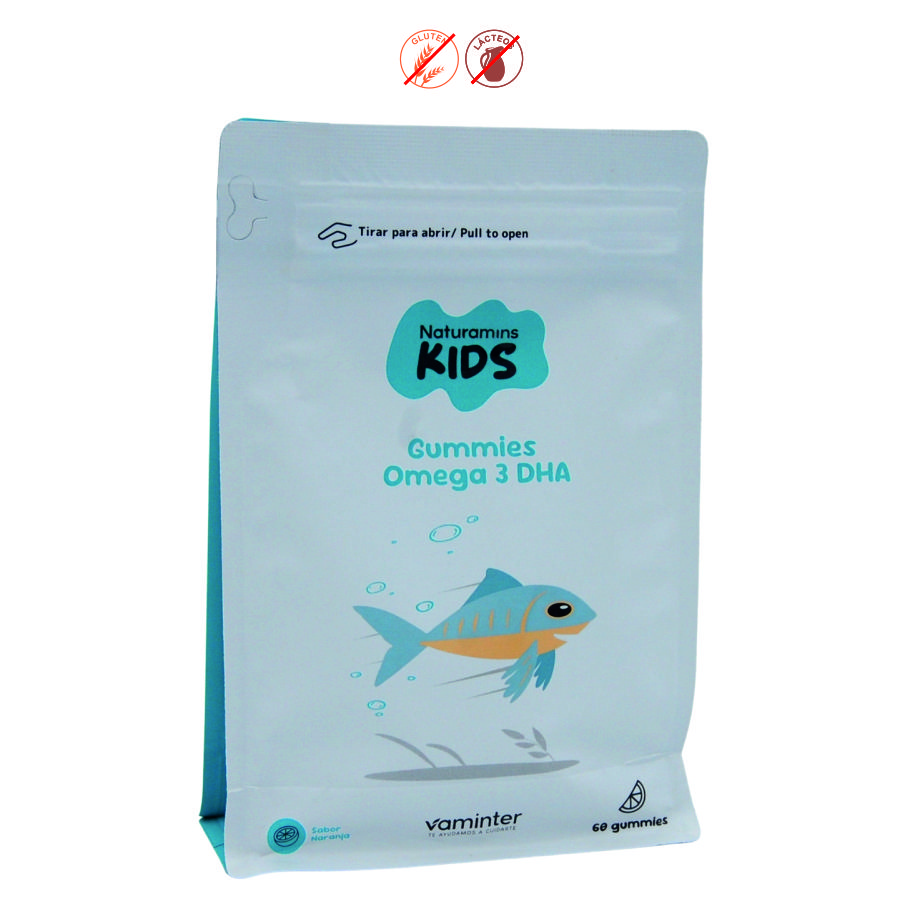 Azúcar de caña*, sirope de glucosa*, concentrado natural de manzana, aceite de algas (Schizochytrium sp) rico en DHA (soja), mix de vitaminas: A, D, E y colina bitartrato; pectina, aromas naturales y de naranja, regulador de acidez: ácido cítrico; color natural, recubrimiento: cera de carnauba. *Procedente de agricultura ecológica
