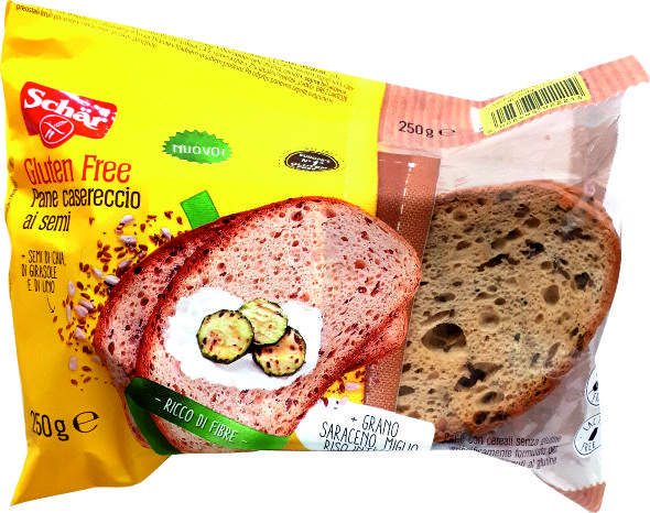 Almidón de maíz, agua, masa madre(12%)(harina de arroz, agua), harina de alforfón(3,6%), harina de arroz, semillas de lino(3,4%), fibra vegetal(psyllium), almidón de arroz, jarabe de remolacha, semillas de girasol(2,9%) , espesantes: (hidroxipropilmetilcelulosa, celulosa), proteína de SOJA, levadura, sal marina, aceite de girasol, harina de mijo(1,4%) ,harina de arroz integral(1,4%) , semillas de chía(1,2%), extracto de manzana, azúcar.