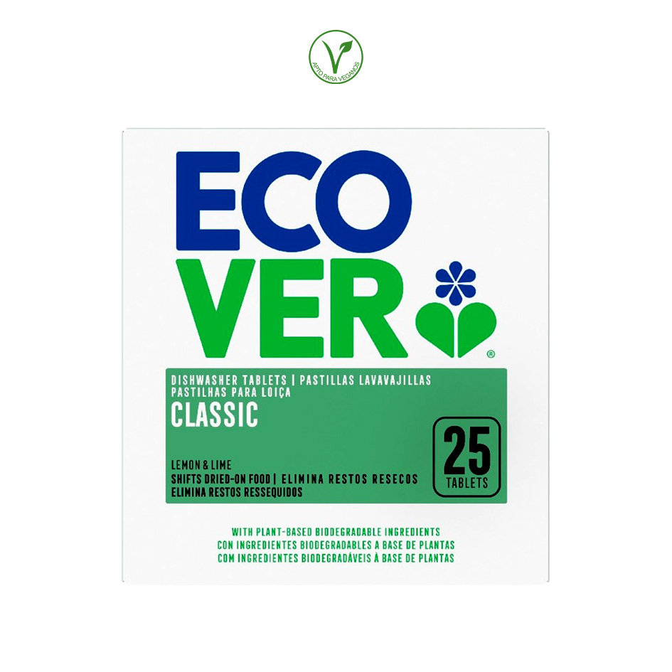 Retire el envoltorio y coloque la pastilla en el compartimiento. No coloque la pastilla en la cesta de cubiertos. Preferiblemente, haga funcionar la máquina en modo Eco. Solo coloque material apto para lavavajillas. No coloque: madera, plata, aluminio, estaño, cobre, antigüedades, cerámica pintada a mano, ciertos tipos de plásticos. En caso de duda, lavar las vajillas a mano con detergente líquido lavavajillas Ecover. Dosis: 1 Pastilla.