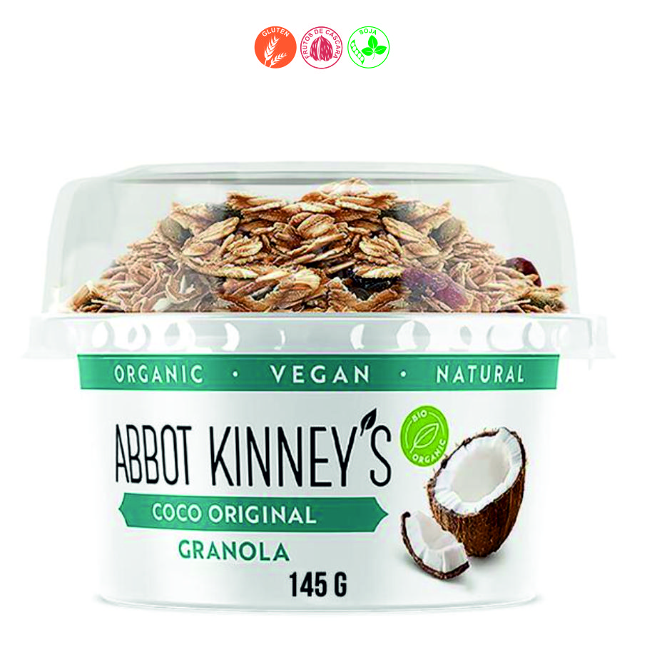 Leche de coco*(81%) (extracto de coco* 48%, agua), ganola*(17%) (copos de CENTENO*, copos de AVENA*, azúcar de caña*, aceite de girasol*, harina de TRIGO*), almidón, espesante: (goma guar), cultivos de yogur.