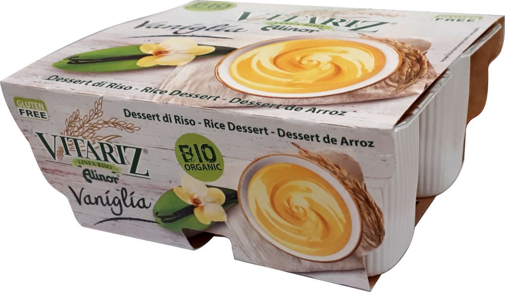 Agua, almíbar de maíz*, arroz*(10%), almidón de arroz*, aceite de girasol*, gelificante: (carragenina, goma de guar), sal marina, aroma natural de vainilla*. *= Procedente de Agricultura Ecológica.