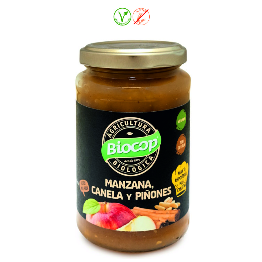 Manzana* (120gr de manzana por 100gr. de producto acabado), azúcar de caña*, piñones (0,9%), canela en polvo* (0,1%). *= Procedente de agricultura ecológica.