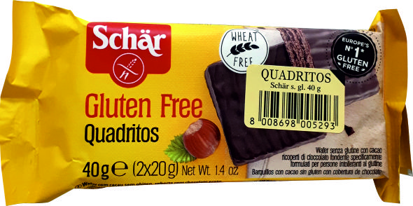 Chocolate negro(42%), fécula de patata, azúcar, grasas vegetales, cacao(5%), AVELLANAS(2%), harina de SOJA, emulgente: (lecitina de SOJA), espesantes: (harina de semilla de guar), gasificantes: (bicarbonato sódico), LECHE desnatada en polvo.