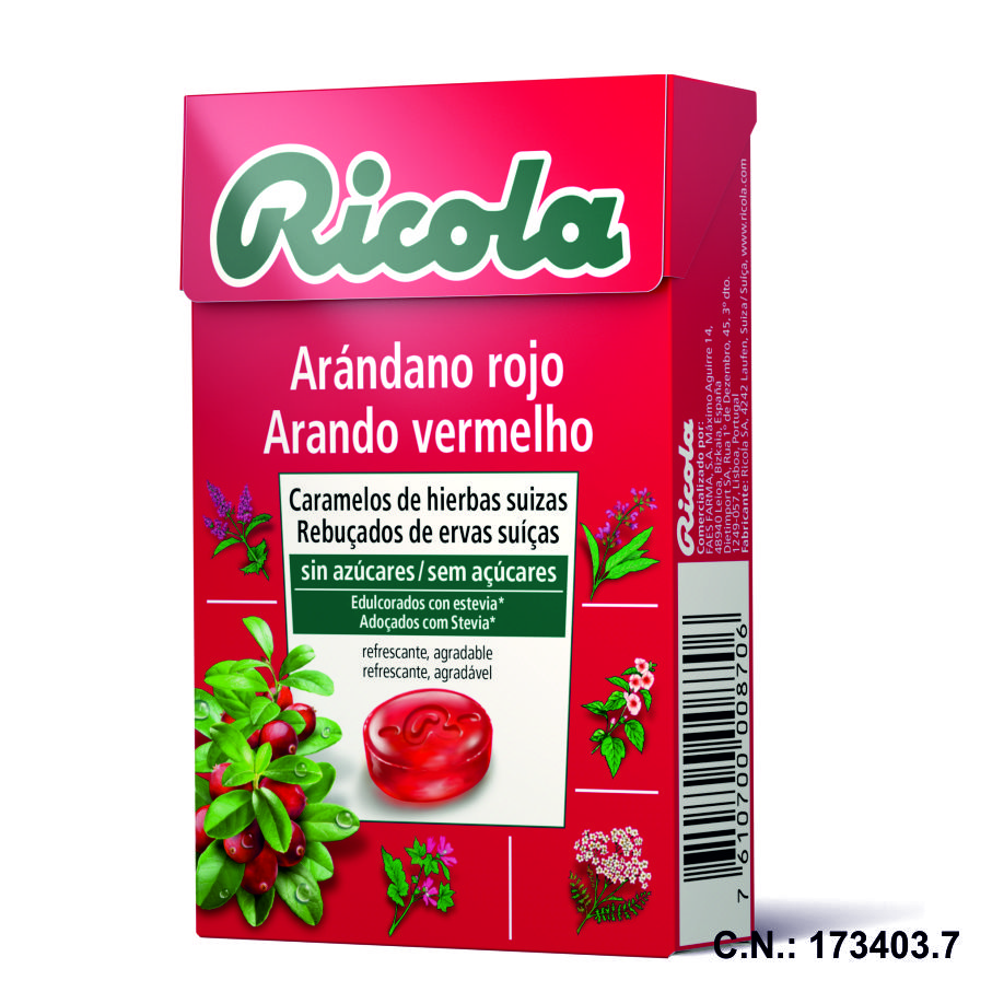Isomaltosa, acidulate (ácido cítrico), zumo (0.6%) de arándano rojo americano (Vaccinium macrocarpon Aiton), concentrado, mezcla (0.5%) de hierbas Ricola, zumo de Aronia melanocarpa concentrado, edulcorantes (aspartato, acesulfamo-K), vitamina C, aromas naturales.