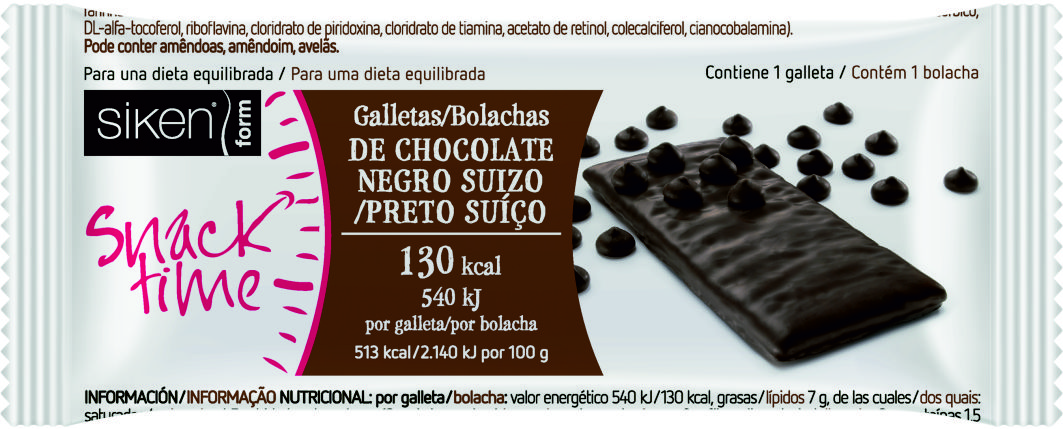 Chocolate negro (77%) [azúcar, pasta de cacao, manteca de cacao, grasa LACTEA, emulgente (lecitina de girasol), aroma], harina de TRIGO, harina de maíz, salvado de TRIGO, dextrina de maíz, espesante (E-414), azúcar, sal, LACTOSA, vitaminas (ácido L-ascórbico, DL-alfa-tocoferol, riboflavina, clorhidrato de piridoxina, clorhidrato de tiamina, acetato de retinilo, colecalciferol, cianocobalamina).