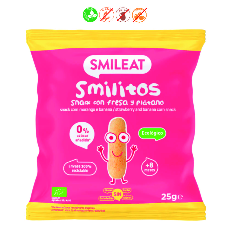 Sémola de maíz* (75%), aceite de oliva virgen extra* (13%), plátano en polvo* (8%), fresa en polvo* (4%), vitamina B1. *= Procedente de agricultura ecológica.