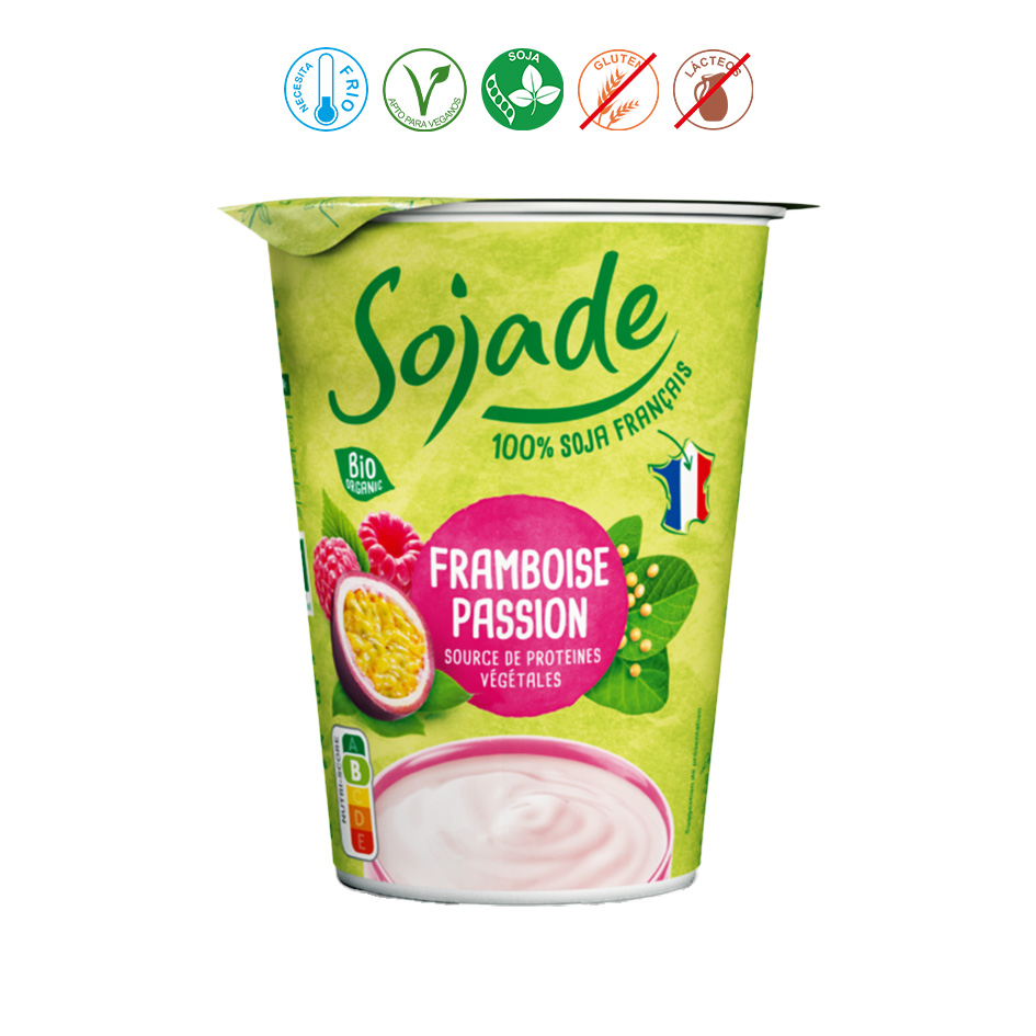 Bebida de SOJA*(78%) (agua, habas de SOJA descascarilladas*(9,2%)), azúcar moreno de caña no refinado*, frambuesa*(7%), zumo de fruta de la pasión*(2%), zumo concentrado de saúco*, espesantes: (harina de semillas de algarroba, goma xanthano), aroma natural*, fermentos activos seleccionados de los cuales Bídus y Acidolus. *= Procedente de agricultura ecologica.