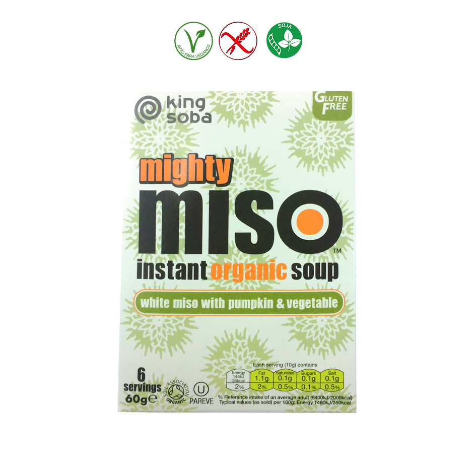 miso*(60%) (SOJA*, arroz integral*, sal marina, cultivo de aspergillus oryzae), tamari* (SOJA*, sal marina), calabaza*(25%), cebolla*, chalota*, cebolleta* y pimienta negra*. *= Procedente de agricultura ecológica.