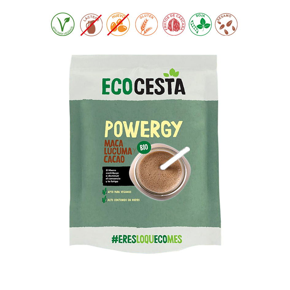 maca raíz en polvo* (Lepidium Meyenii) (67%), cacao polvo* (Theobroma cacao) (20%) y lúcuma polvo* (Pouteria lucuma) (13%). *= Procedente de agricultura ecológica.