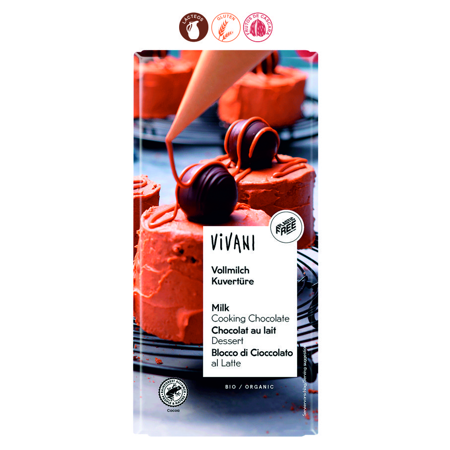 Azúcar de caña integral*, manteca de cacao*, LECHE* entera en polvo(18%), pasta de cacao*, emulgente: lecitina de girasol*, extracto de vainilla bourbon. *= Procedente de agricultura ecológica.