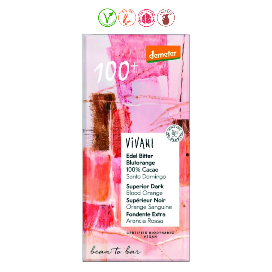 Pasta de cacao**, mateca de cacao**, cacao en polvo**, aceite de sanguina* (0,4%). *= Procedente de agricultura ecológica. **= Procedente de agricultura ecológica y biodinámica.