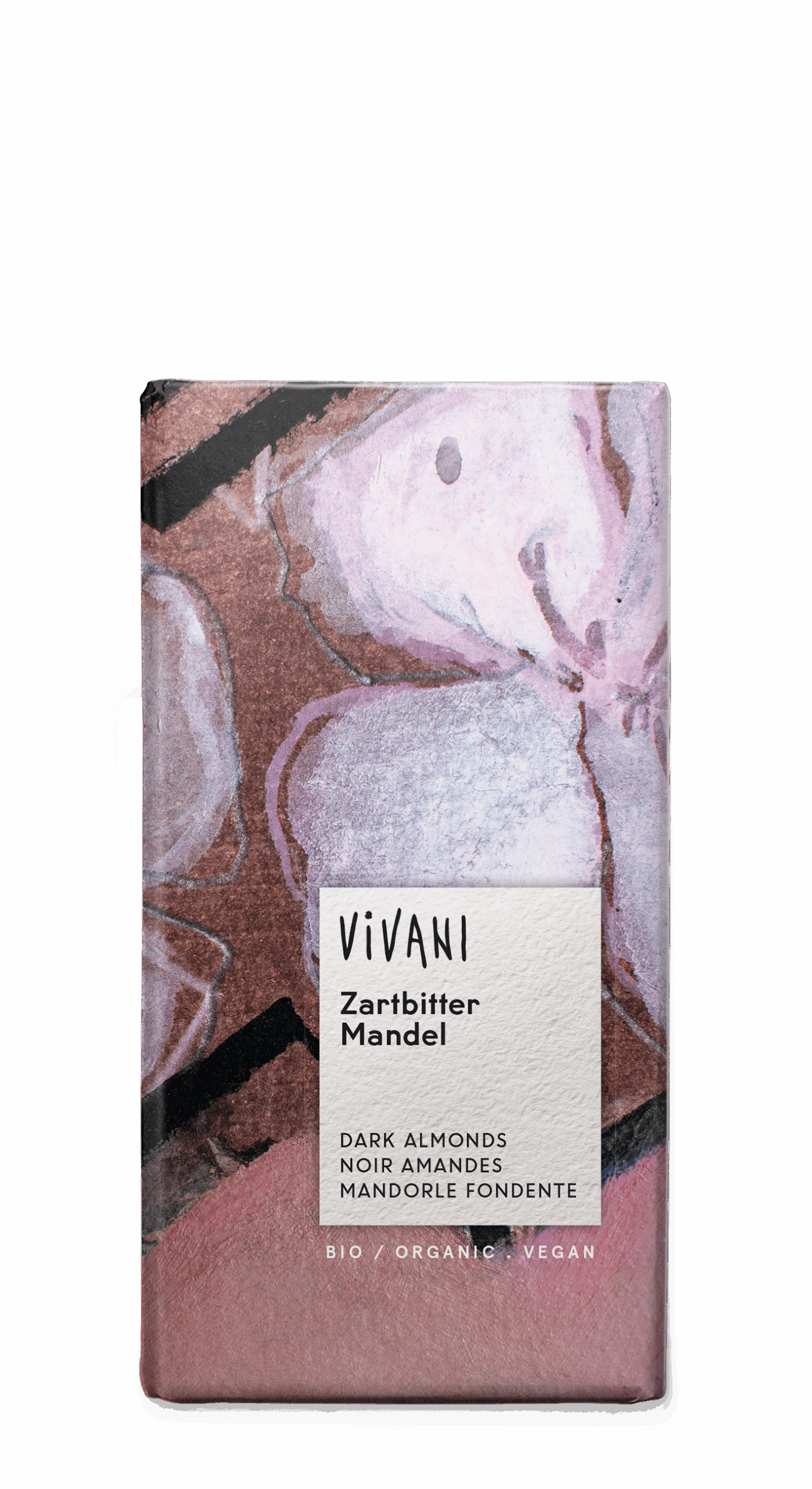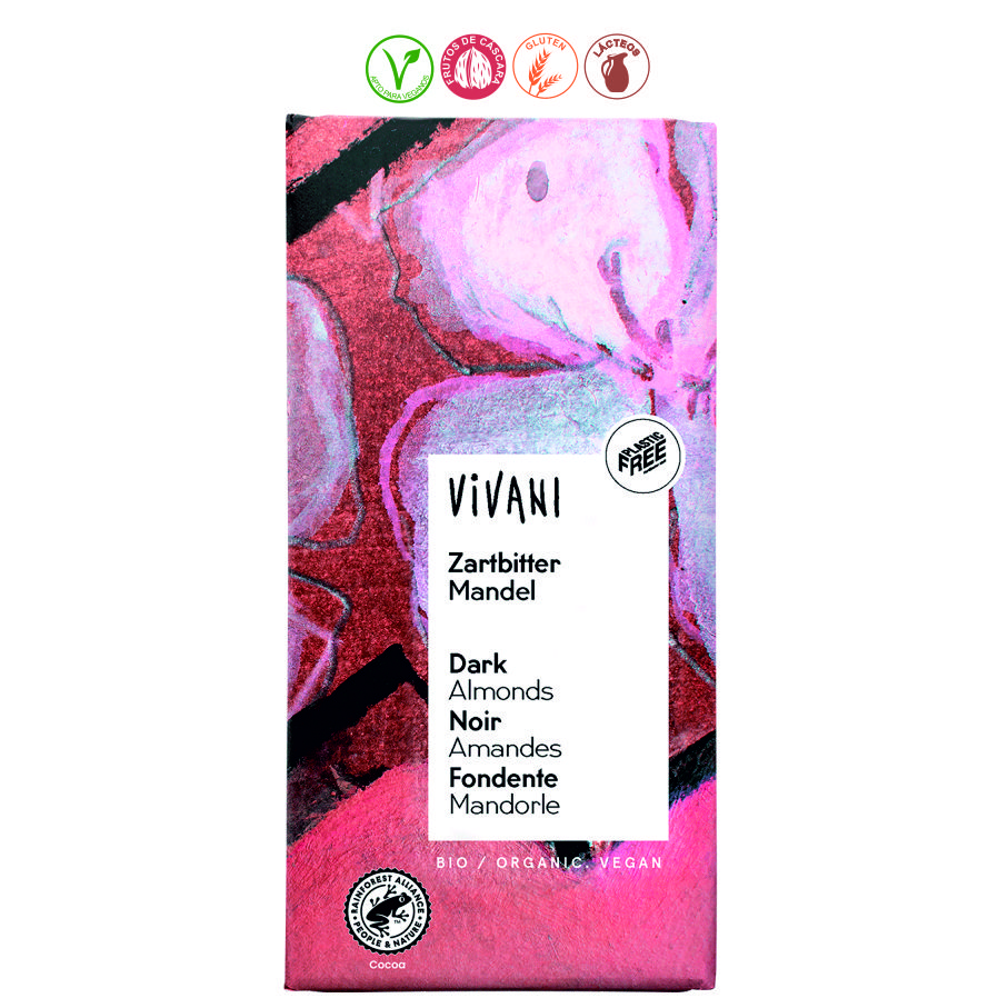 Pasta de cacao*, azúcar de caña integral*, ALMENDRAS*(29%), manteca de cacao*, ALMENDRAS* ralladas. *= Procedente de agricultura ecológica.
