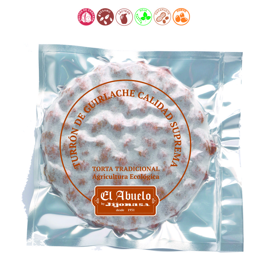 ALMENDRA tostada* (62%), miel*, azúcar de caña*, semilla de SÉSAMO* (7%). Oblea* en superficie (fécula de patata*, emulgente: lecitina de girasol*). *= Procedente de agricultura ecológica.