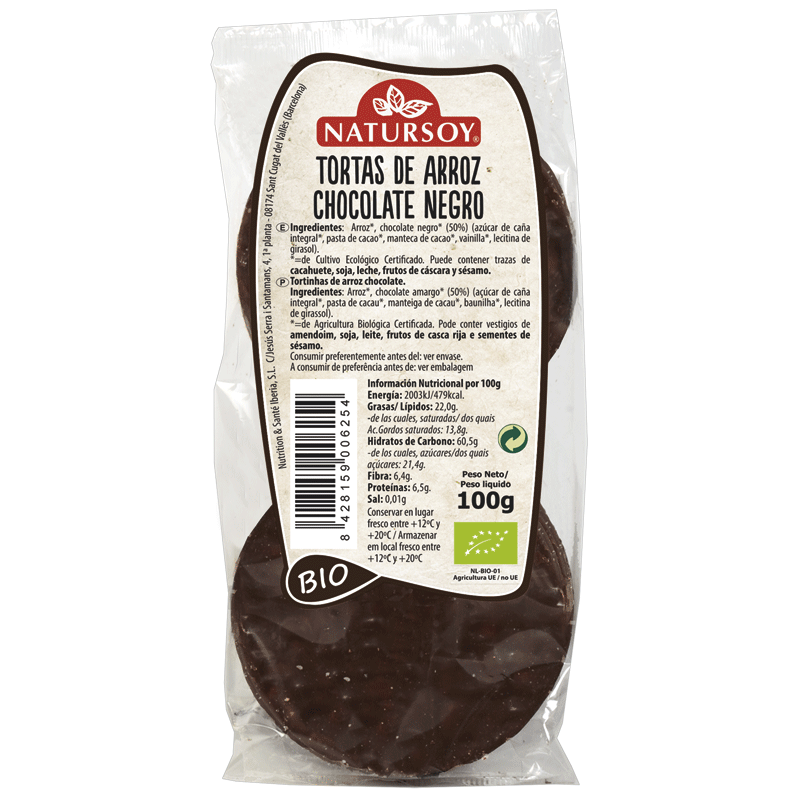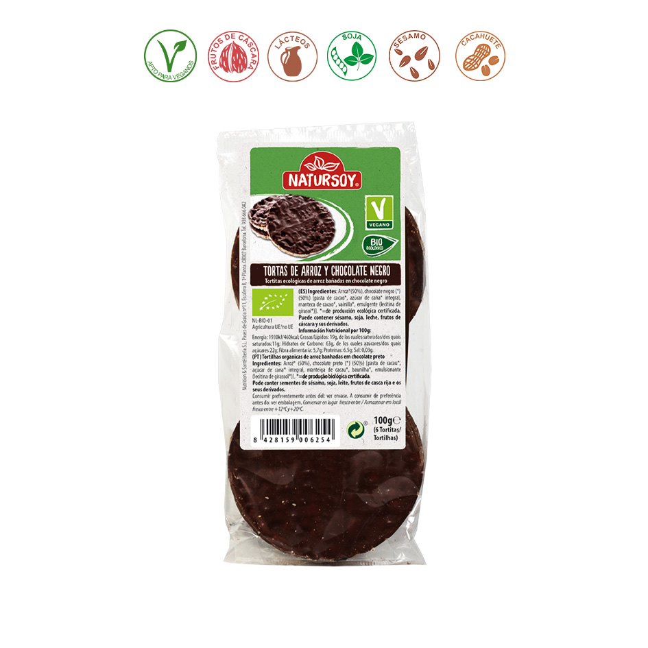 Arroz*, chocolate negro*(50%) (azúcar de caña integral*, pasta de cacao*, manteca de cacao*, vainilla*, lecitina de GIRASOL). *= Procedente de agricultura ecológica.