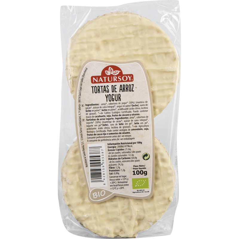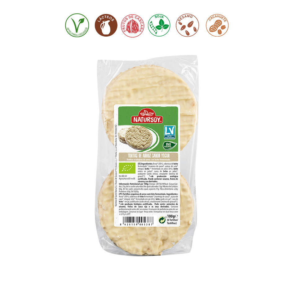 arroz*, cobertura de YOGUR*(50%) (manteca de cacao*, azúcar de caña integral*, YOGUR en polvo* (LECHE), suero de LECHE en polvo*, LECHE en polvo*, acidificante: ácido cítrico, lecitina de GIRASOL). *= Procedente de agricultura ecológica.